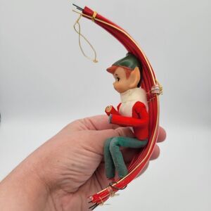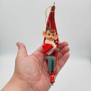Vintage Rare Felted Pixie Elf on a Red Hammock Swing Christmas Ornament