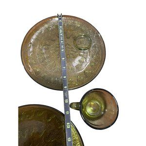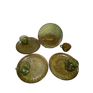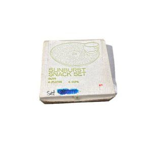 Rare find and in its original box. Reference number 2749. 4 plates and 4 cups. Each place has a ring on it for the cup holder as shown in pictures. Vintage Indiana Glass Co. Sunburst Dish Snack Set. Shipping includes tracking and insurance.