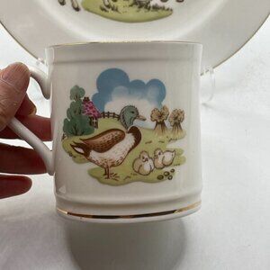 Made in England from fine bone china, this set features a plate, bowl and cup decorated with cow, lamb, duck, etc.