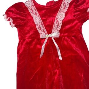 Adorable red satin baby romper with lace trim and ribbon detail. Perfect for special occasions.