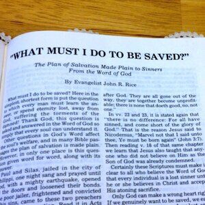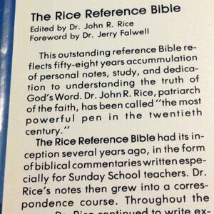 1981 Thomas Nelson edition of The Rice Reference Bible. Hardback in good condition for age. Inside pages clean but dust jacket has a lot of wear. Stained area in corner, shown in photos. Does not affect any readable text. The book underneath is in good condition, see photos without dust jacket. Please see all photos. Includes Rice's famous "What Must I Do To be Saved?" lecture.