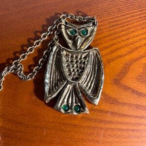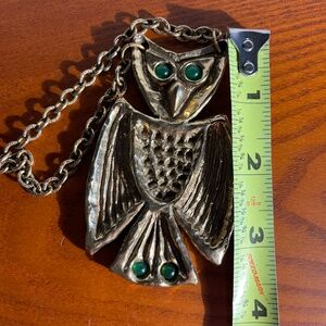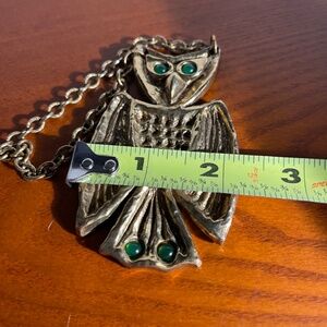 Vintage Rare Zentall Owl Necklace- Gold Tone With Green Eyes & Green On Tail. It is in mint condition . It measures 23 1/2" long & The owl measures 3n1/2" long x 2 1/8" wide across the bottom of the wings. It weighs 3.2 ounces.