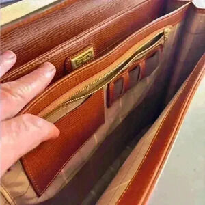 Stay in style on your business endeavors with this Burberry briefcase. Its tan/ cognac leather exterior is coupled with a golden slide lock, a key and clochette, as well as a leather top handle.