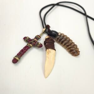 Vintage Rattlesnake Tail Rattles Cross Bone Pendant On Leather Cord