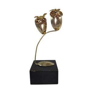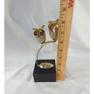 A classic MCM sculpture featuring two owls sitting on a branch. Crafted from scrap metal including a silverplated spoon and mounted on a wood base.