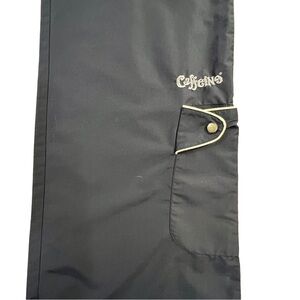 Vintage Caffeine navy blue extra wide leg lightweight baggy rave goth pants from the late 90’s early 2000’s. Pants have very low cargo pockets, are made from a very lightweight material, and have fun sparkly buttons, super wide legs! They are a navy blue with a white reflective trim.