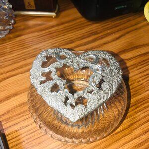 This small glass bowl is perfect for potpourri or jewelry adorned with a dated Rawcliffe Pewter top decorated with roses and ribbons.