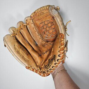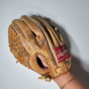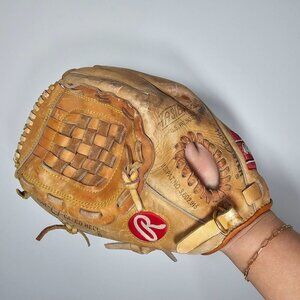 Tags: Baseball glove, Rawlings glove, vintage sports, adult glove, right-hand throw, leather glove, tan glove, collector's item, basket-web, sports gear, classic baseball, Rawlings RBG, right-handed