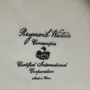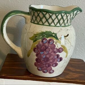 From the Certified International Corporation by Richard Waites Cornucopia Collection. Stands between 7.5-8” with a diameter of 5”. Trimmed in green with stucco look. A bunch of grapes adorn the sides. Perfect gift idea or for your kitchen/dining as a centerpiece