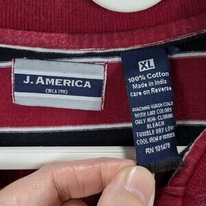 Vintage J. America Razorbacks Polo Shirt. Men's Size XL or Extra Large. Red, Black and White Stripes with an embroidered Hogs Logo on the front. University of Arkansas. There is some wear around the logo and on the fabric as expected with age. Washed and ready to wear. I don't see any other blemishes. See photos for details and measurements.