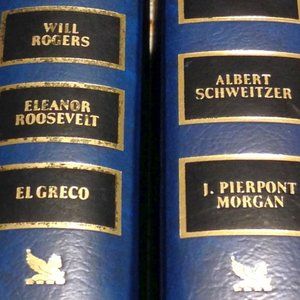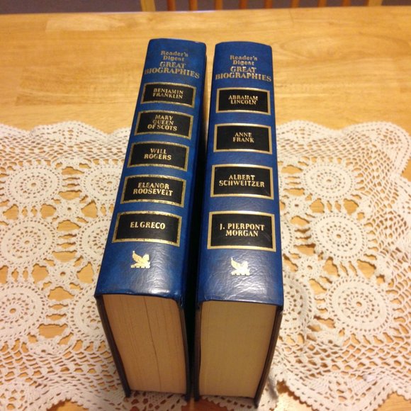 Two hardback editions of Great Biographies from Reader's Digest. 1st editions from 1987 and 1989. Attractive for farmhouse book decor. Please note that there is some spotting on the edges, see close up. Also please note a bit of paint loss on the gold lettering on one. Otherwise, light cover wear. Includes biographies of famous people including Will Rogers, Mary Queen of Scotts, El Greco, Albert Schweitzer, Eleanor Roosevelt and more.