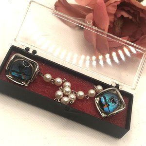 Morpho butterflies, often very expensive, have always been prized by extremely wealthy collectors. They are reverse-painted glass. This is new in the original box and probably never worn!