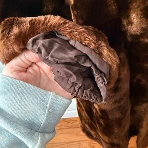 This does not have a size, but I measured it. Please refer sizing below for proper fitting. This is a beautiful rich brown color and the fur is real shearling fur. It’s a very heavy and warm. In picture four it’s showing that it’s missing the loop for the hook. That’s an easy fix. Also on the inside lining, there’s a small space that needs to be stitched back up. No returns.