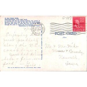 This vintage postcard from 1955 showcases a historic scene in Provincetown, Massachusetts, featuring the Ye Old Town Crier. It's a nostalgic piece that captures the essence of mid-20th-century Americana and highlights the charm of Cape Cod's rich traditions. Perfect for collectors of vintage postcards and history enthusiasts.