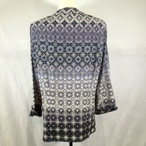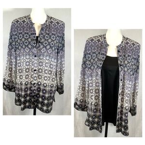 Beautiful colors and patterns in this top with built in black shell cami and shoulder pads. Button down front. Can be worn open or buttoned for different looks. Cuffed sleeves. Euc