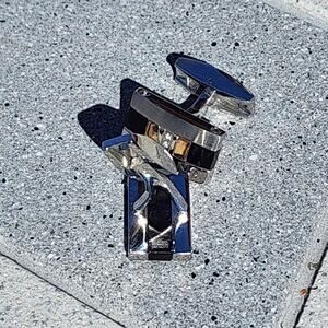 VTG: Elevate your style with these impeccable rectangle two diamond accent, 18kt yellow gold, titanium, onyx & polished/satin finish stainless steel cufflinks. The must have accessory for any fashion-forward man, these cufflinks boast a sleek design with a touch of opulence. Crafted with high-quality materials, these cufflinks are sure to last for years to come, making them an investment worth making. Perfect for any occasion, they add a personal touch of dashing sophistication.