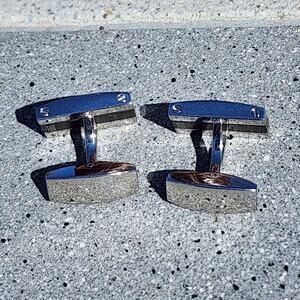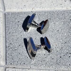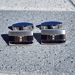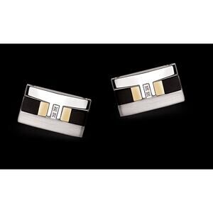 VTG: Elevate your style with these impeccable rectangle two diamond accent, 18kt yellow gold, titanium, onyx & polished/satin finish stainless steel cufflinks. The must have accessory for any fashion-forward man, these cufflinks boast a sleek design with a touch of opulence. Crafted with high-quality materials, these cufflinks are sure to last for years to come, making them an investment worth making. Perfect for any occasion, they add a personal touch of dashing sophistication.