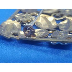 Vintage Rectangle Open Flowers Leaves Rhinestone Gold and Silver Tone Brooch Pin
