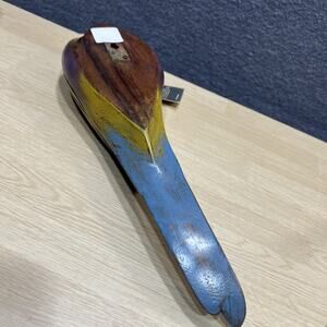 This Vintage Hand Carved Hanging Parrot is a beautifully crafted painting made of wood, featuring a parrot as the subject. Hand-painted with intricate details, this piece is a unique and charming addition to any collection. Originating from Indonesia, this handmade artwork showcases the beauty and craftsmanship of traditional artistry. Perfect for bird enthusiasts or collectors of artisanal pieces, this XL-sized parrot is sure to stand out as a one-of-a-kind item.