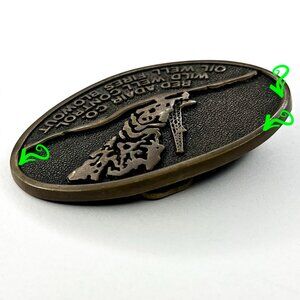 Own a piece of oilfield history with this vintage belt buckle commemorating the legendary Red Adair Co. Known worldwide for their expertise in wild well control, oil well fires, and blowouts, Red Adair was an iconic figure. This oval-shaped, antique brass-tone buckle features an embossed scene depicting an oil well blowout, with the company's famous motto below: "RED ADAIR CO. WILD WELL CONTROL OIL WELL FIRES BLOWOUT." It's a unique find for collectors of Western Americana, oil and gas memorabilia, or vintage belt buckles.