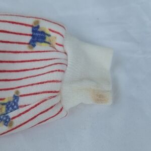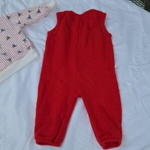 Adorable red baby overalls featuring a cute bear patch. Comes with a matching striped sweater with playful patterns.