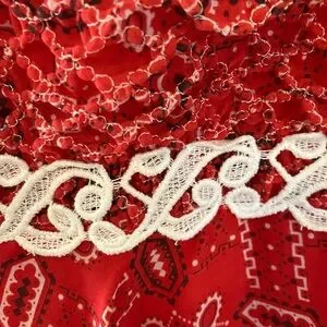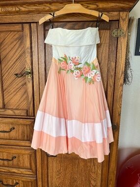 Lined, seam on lining needs repair. Smocked top (not stretchy), lace appliqué on waist. Cotton blend material.