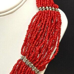 Vintage Red Beaded Multi-Strand Necklace With Silver Accents 20" HS195