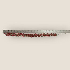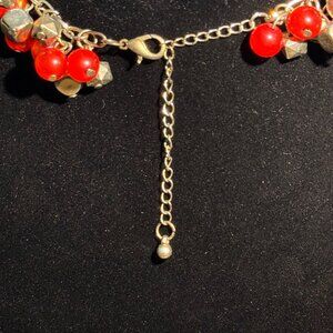 This vibrant necklace features bold red beads accentuated by a gold-tone chain, offering a striking piece for any jewelry collection.