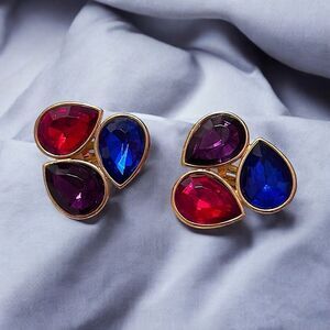 Vintage Red, Blue, And Purple Rhinestone Gold Tone Statement Clip On Earrings