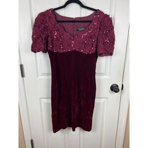 Vintage Red Burgundy Velvet Sequin Puff Sleeve Bodycon Holiday Party Dress Sz 8