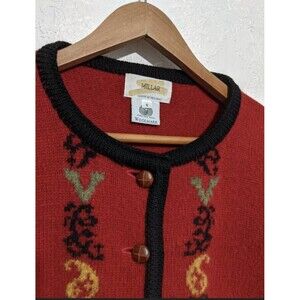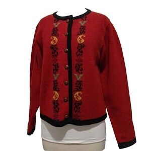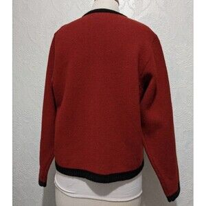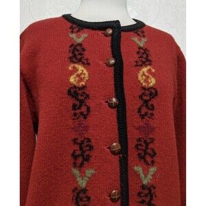 Vintage Woolmark wool cardigan sweater marked a size S in a deep red color with buttoned front. Condition is excellent Pre-owned. This sweater is so pretty with black edging detail and unique designs along to front. No holes. Not pilly . Leather look buttons. Made in Ireland.