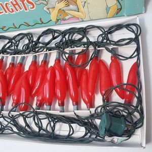 String of 35 Red Chili Pepper Party Lights. This is a vintage 1980's set of lights that have not been used and are still in their original packaging. Each chili light measures approximately 3-1/2" long.
