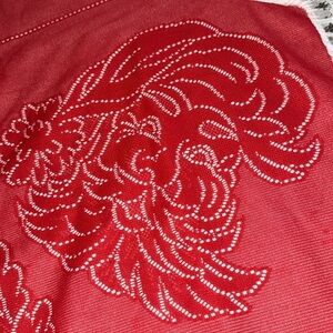 Festive red Christmas tree skirt featuring intricate patterns and white fringe trim. Perfect for holiday decor.