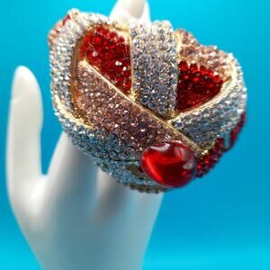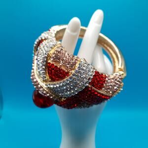 *Description: This is a beautiful pave rhinestone clamper hinged bracelet from the 1980s to 1990s. The bracelet has a red clear cabochon on top. It is a substantial bracelet at 5.6 Ounces. The bracelet springs closed and does not have a clasp. This is a statement bracelet with a lot of bling. This would be a great addition to your jewelry collection or make a great gift!