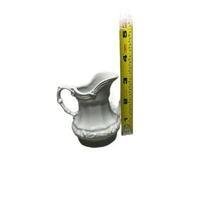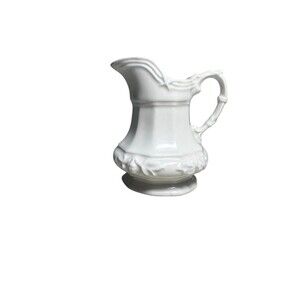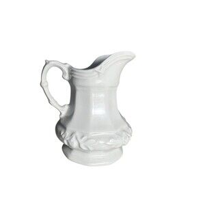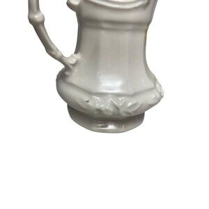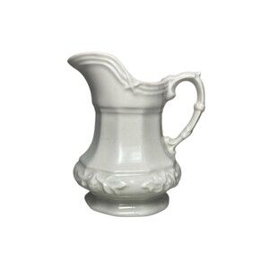 Add a touch of elegance to your collection with this vintage Red Cliff Ironstone miniature creamer pitcher. The intricate grape leaves design adorns the white stoneware, making it a perfect addition to your table decor. This creamer pitcher stands at 3 1/8" tall and is the perfect choice for your morning coffee or tea.