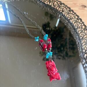 Vintage Red Coral Floral & Turquoise Pendant Necklace