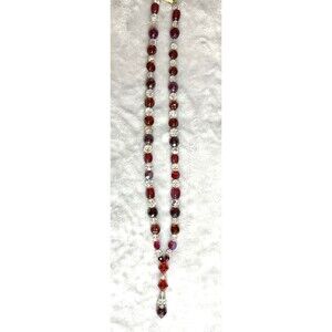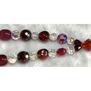 Elegant vintage red glass and crystal beaded Y-drop necklace featuring a dazzling combination of ruby red, amethyst, and iridescent aurora borealis beads.