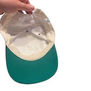 Rare vintage Red Dog snapback hat featuring the iconic bulldog logo in bold red and black. Made in the USA by KC, this hat showcases a classic two-tone design with a white crown and black brim, paired with a striking green underbill. Inner sweatband shows light discoloration consistent with age. The original KC tag is still intact, and the adjustable snapback closure ensures a comfortable fit.