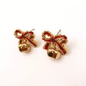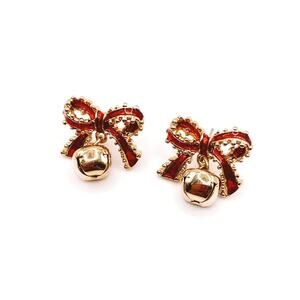 These charming vintage earrings feature a festive red enamel bow design with a delicate dangling bell accent, creating playful movement and eye-catching appeal. The glossy red enamel adds a vibrant pop of color, while the bell detail brings a whimsical, elegant touch.