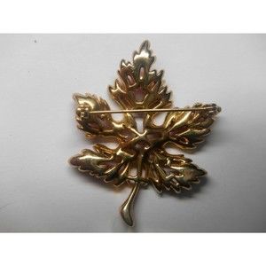 Vintage Red Enamel Rhinestone Maple Leaf Gold Tone Brooch Pin. Approx. 1 5/8" tall and 1 1/2" wide.