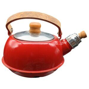 This vintage red enamel tea kettle features charming wooden accents and a timeless design. Its rustic appeal makes it a practical yet decorative kitchen piece.