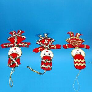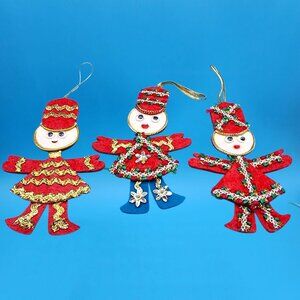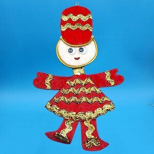 Bring whimsical retro charm to your holiday décor with this adorable set of vintage toy soldier ornaments! Each red felt soldier features playful googly eyes, shimmering gold trim, and tiny sequins, adding personality and sparkle to any Christmas tree. A fun collectible set with timeless mid-century appeal.