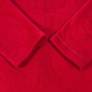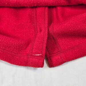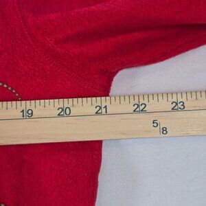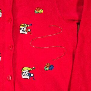 This vintage red fleece cardigan features playful embroidered Cat and yarn designs. Button-up closure and long sleeves ensure comfort and warmth.