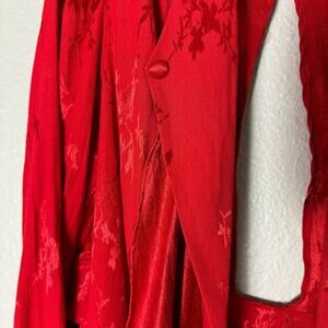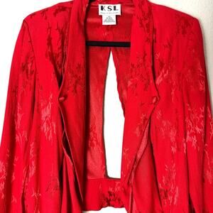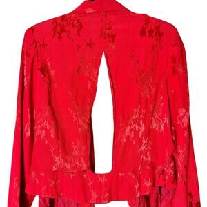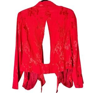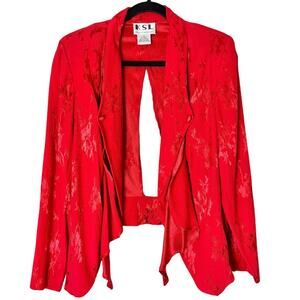 Excellent used condition! Bright red brocade blazer/jacket. Draped open front with satin accents and buttons on lapel. Fun open back. Long sleeved with shoulder pads and partially lined. A fun vintage jacket to add to your collection.