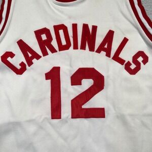 Vintage athletic jersey, featuring a classic design with bold "Cardinals" lettering and the number 12 prominently displayed on both the front and back. This sleeveless jersey boasts a crisp white body contrasted by vibrant red accents on the collar and arm openings, creating a sporty and eye-catching look. The jersey is made with high-quality materials for comfort and durability. Perfect for casual wear, sports events, or as a nostalgic piece for fans of vintage athletic apparel. Made in USA.