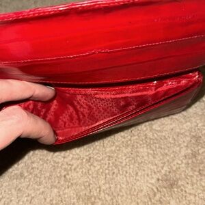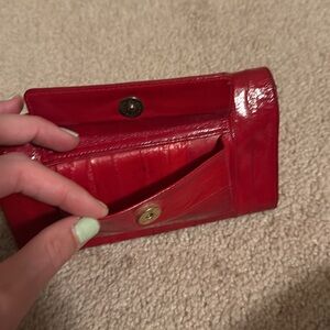 Add a pop of color to your outfit with this elegant red leather clutch. Its sleek design is perfect for both day and night outings. Genuine, eel, leather, made in Korea good condition.