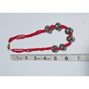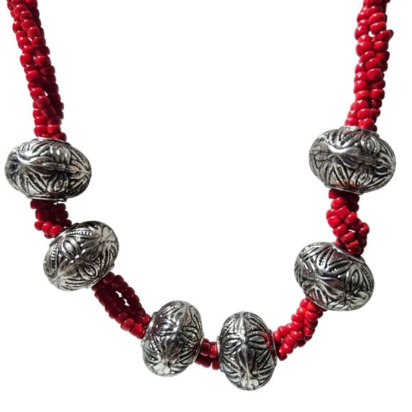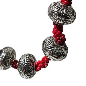 This handcrafted necklace features alternating silver-tone filigree beads and vibrant red glass seed beads. The ornate metalwork and traditional design elements create a sophisticated ethnic-inspired piece.