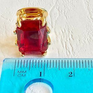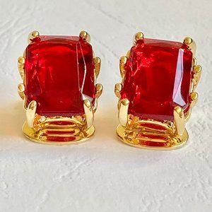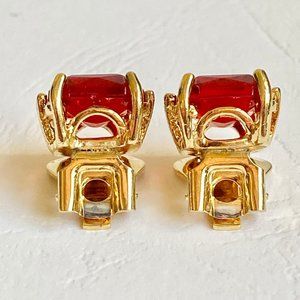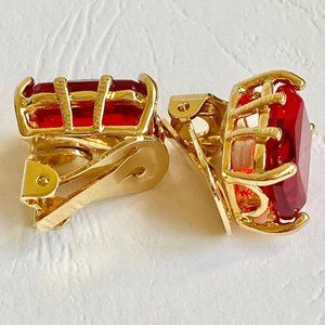 Vintage Red Glass Jewel Cut Gold Plated Clip On Earrings 1970s Made in USA New