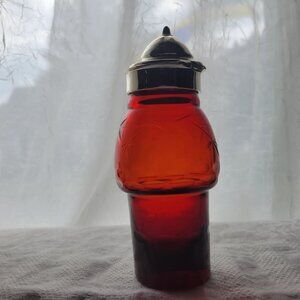 This vintage syrup dispenser showcases an elegant ruby red glass body with delicate etched floral patterns and a silver-tone hinged lid for functional charm.