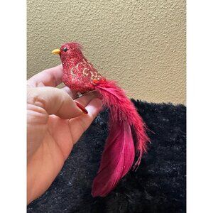 Vintage Red Glitter Bird Ornament Clip-On With Feathers & Decorative Detailing